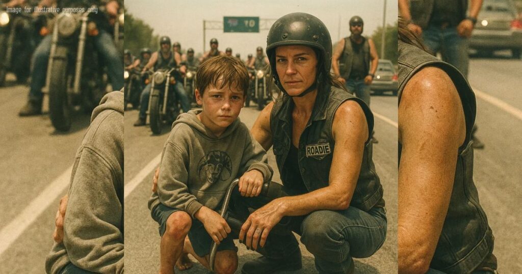 “Hold!” I yelled, and forty bikes stitched three lanes shut with steel and hide. Cars stacked up behind us, horns barking. The kid hit my crash bar and clung like it was the last solid thing on earth.