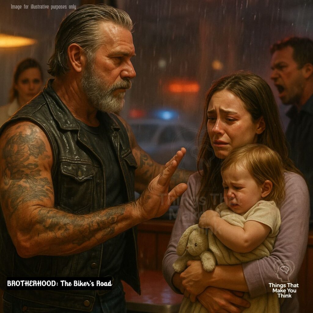 The afternoon heat made the diner windows sweat. We were parked under the faded awning—four bikes, quiet for once—sipping bad coffee and swapping plans for a charity run. The bell over the door chimed. A young mother stepped out, balancing a diaper bag and a baby girl, maybe nine months old, cheeks flushed from summer air. A man followed two paces behind, jaw tight, voice flat in a way that makes a room hold its breath.